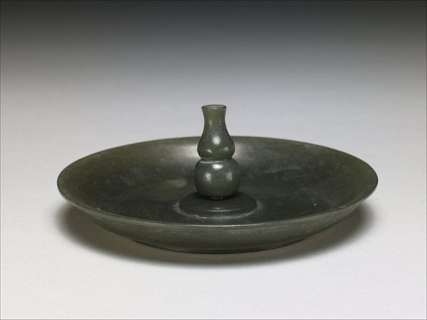 玉質,敞口,淺壁,平底,圈足,中央有一葫蘆形香插。通體光素,香插以嵌合方式與盤連接。