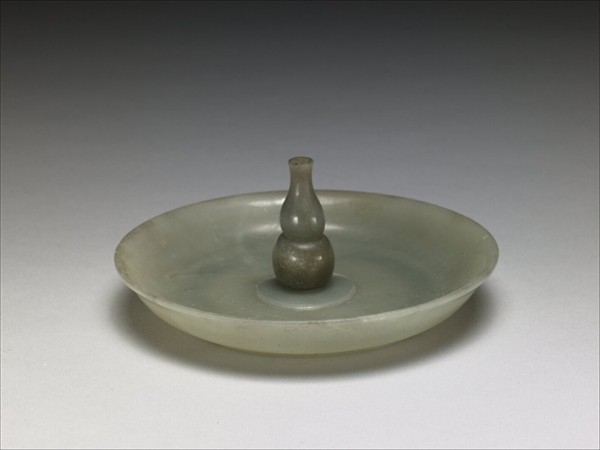 玉質,敞口,淺壁,平底,圈足,中央有一葫蘆形香插。通體光素,香插色澤較深,以嵌合方式與盤連接。