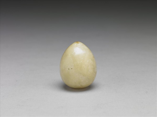 玉質,色澤潤,略帶米黃色,尖端沁黃。上尖下圓如卵形,表面稍加打磨。