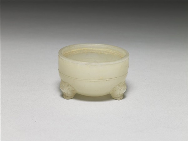 玉質,色澤潔白晶潤,直口,深壁,圓底,口沿下方有一道陰刻弦紋。腹外部中央有兩道陰刻弦紋;足上端刻獸首,下端為如意形。