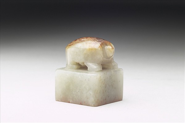 玉章,印面正方,色白有赭斑。印面陰刻四字篆文:「宜爾子孫」。印鈕則雕異獸一隻為飾,獸背上有赭斑。乾隆皇帝嘗收聚八十方古印,命之為「虹文薈古」,並同儲於一盒四屜,此印即為其中一方。
