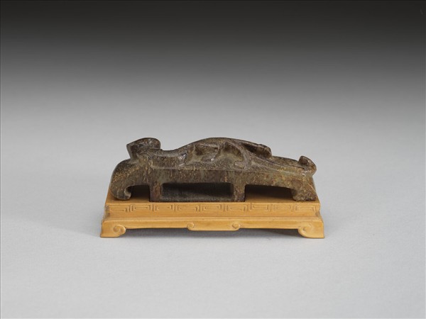 玉質,周身赭斑。方形,背有方扣。面琢蟠龍,身形扭動。附回紋木座。