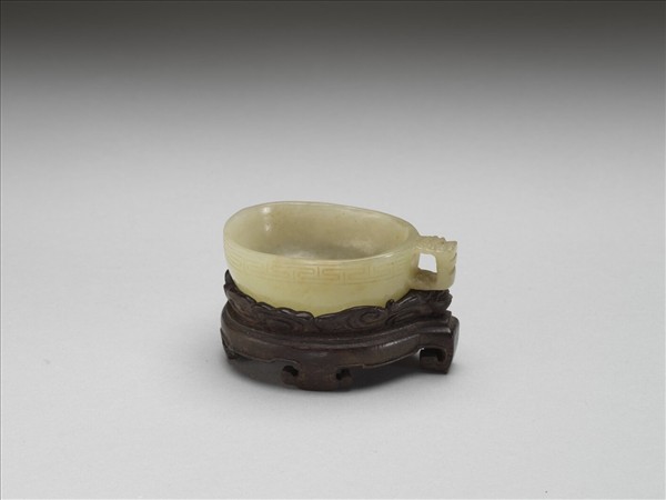 玉質,微泛赭色。圓口,淺弧壁,平底,單柄。口沿琢回紋一周。附木座。