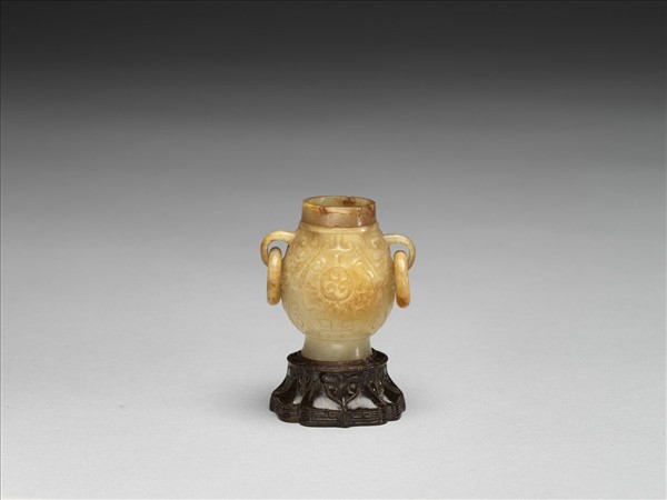 玉質,帶赭斑。敞口,弧壁,高圈足,雙環耳。腹飾雲紋及獸面紋組合的圖樣化紋飾。附木座。