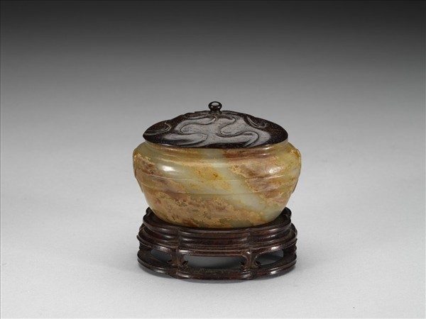 玉質,雜赭斑。唇口,折頸,弧壁,平底。腹飾寬帶紋一道,兩側琢獸首銜環紋。附木蓋、木座。
