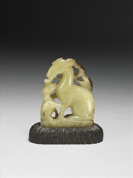 本器是以帶有褐色玉皮的玉籽料雕刻而成,一對子母鹿立於蓮花上,母鹿口銜凌霄花,小鹿將前肢搭在母鹿身上,甚為依賴。附一木座,隨器底雕成一朵扁長形蓮花,面部內凹以嵌入玉飾。在印度佛教傳說中,有鹿母為國王生養了五百個從蓮花裡化生的男童,個個都是俊美的大力士。隨著佛教東傳,中土出現大量以蓮花、子母鹿或童子為主題的玉器,具有祈求「連(蓮)生貴子」的祝福之意。