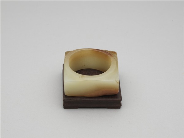 玉質,局部赭斑。方柱體,內圓外方,上下有射口。外壁光素無紋。