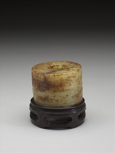 玉質,雜赭斑。蓋、身琢玉環狀,子母口,圓壁,平底。器表飾勾連雲紋。附木座。