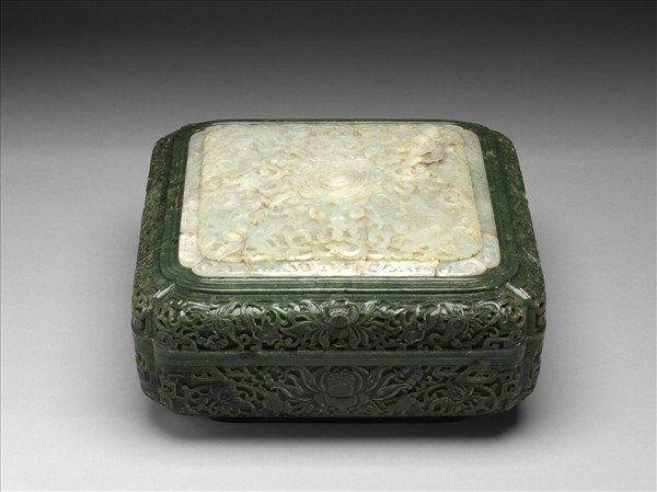 碧玉方盒,蓋面鑲嵌白玉,滿佈浮雕纏枝番蓮花紋,盒底緣雕菊瓣紋一圈,器底中央飾「乾隆年製」四字隸書款。盒內盛各式珍玩二十三件:玉器九件、瓷器一件、瑪瑙二件、印石三件、金珀一件、竹雕籩豆一件、琥珀一件、松石一件、水晶一件、雕漆一件、蚌殼帶扣二件、齋戒牌一件。
