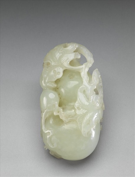 玉質,雕作葫蘆形,色澤均勻。鏤空藤葉枝蔓由上而下環繞於葫蘆上。