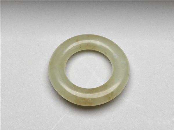 玉環,表面光素溫潤,局部有深淺不一的褐色沁,呈半透明。素環圓整,肉內厚實,孔壁略呈弧狀,外緣磨飾圓滑。