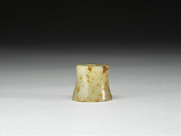 玉質,雜赭斑。圓柱體,中有穿孔。素面無紋。