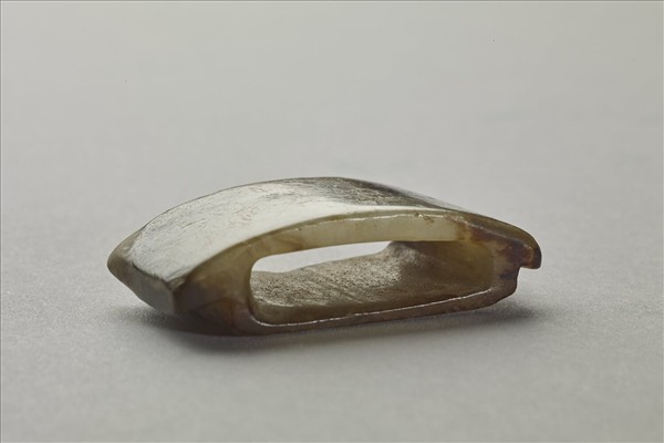 玉質,大部分器表因沁染而呈褐紅色。方體形,中空,素面無紋。