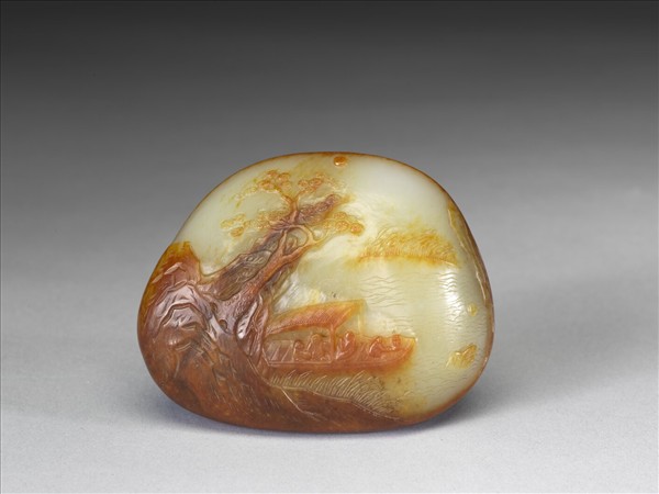 天然小玉塊,外包絳褐色玉皮。一面藉深淺雕刻露出青碧的玉色,使與玉皮高下成雙色剔刻效果。圖作東坡赤壁景,在深褐色石壁上斜植老松,一舟自壁後盪出,舟上三人坐談、童子舟尾烹茶,樹梢的圓月正投影在輕風微波的江心上。另一面則保持玉皮平滑的原色,並刻乾隆三十八年(1773)題銘︰「磨彰白質絳華留,設色居然赤壁遊。水裏月原天上月,刻成舟勝畫為舟。烹茶那慮避烟鶴,鼓枻不驚眠渚鷗。屢舉黃州休致誚,箇中人物足千秋。乾隆癸己仲秋中澣御題。」印︰「乾」、「隆」。紫檀木座雕水波紋以承之。