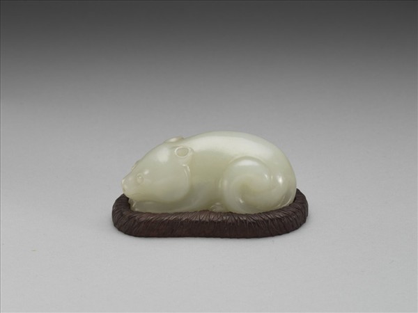 玉質,色青白。琢玉鼠臥伏在地,斂足,捲尾。附木座。