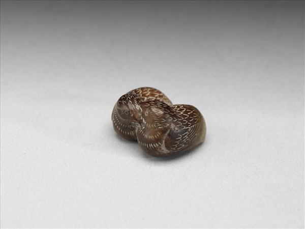 玉質,泛大片赭色。雕成對雙鳧,兩相依偎,互啄翎毛。全器以細密線刻飾其豐滿毛羽。中有穿孔。
