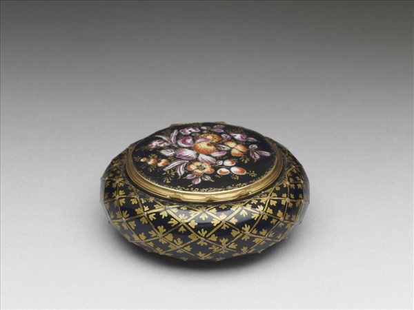藍玻璃描金鑲金邊扁圓小盒,貯赭玉鵪鶉一對。盒蓋飾畫琺瑯花束,盒身及底部皆滿飾連續菱格切面並描金繪草葉紋。藍地映金,加以切面反光,具華麗裝飾效果。此器為歐洲作品。