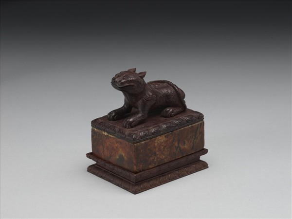 玉質,方印,印面「軍曲侯印」白文4字,無邊。整體篆法工整清秀,筆畫雕琢細緻,四角磨圓。附木質獸鈕,木座。