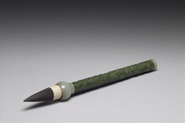 碧玉筆管,上下膠接青白色玉頂及筆斗,斗內納筆毫,青玉頂端刻太極圖案;碧玉筆管浮雕雲龍紋,雕紋深峻繁複。此器貯放於嵌玉石博古圖八方盒(故漆522)中。