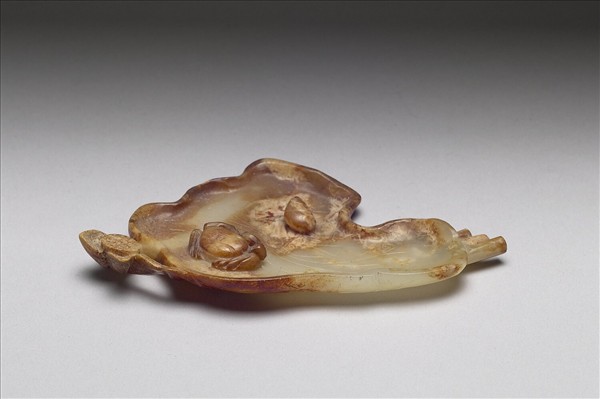 玉質,帶大塊赭斑及皮殼。筆覘,雕作不規則荷葉形,葉緣翻起呈淺盤狀,邊緣浮雕蓮藕及荷莖,葉心刻陰線作葉脈,並雕飾蟹與螺,造形自然生動,頗富趣味。此器貯放於嵌玉石博古圖八方盒(故漆522)中。