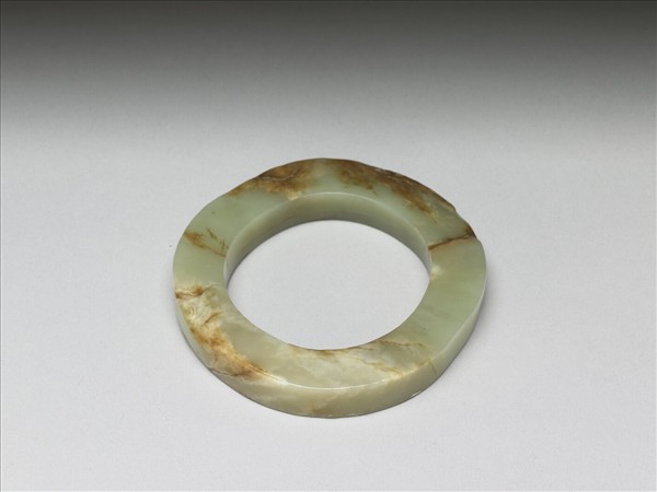 玉質,帶褐色皮殼,表面佈有數條沁褐色的玉璺。全器光素無紋,環內側留琢玉痕,表面稍經打磨,外形不規整,留有剛切割時的原貌,為清宮收藏新石器時代的玉器。此器貯放於嵌玉石博古圖八方盒(故漆522)中。