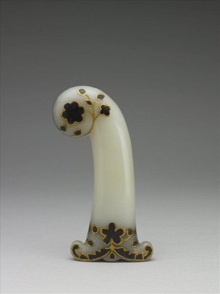 玉劍柄,劍柄頂端稍收回卷如將萌未發的嫩稍,末端與劍柄相接處,亦向兩側卷出如嫩稍的樣式,其兩端貼金填綠的卷枝花葉。附木座。此器貯放於嵌玉石博古圖八方盒(故漆522)中,為蒙兀兒帝國作品。