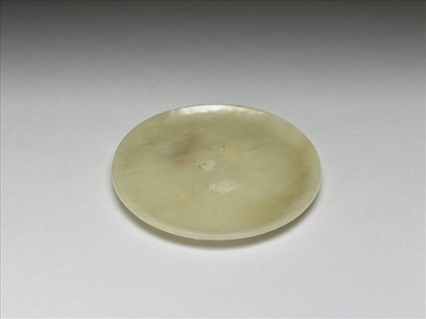 玉質,淺弧壁外敞,平底。整器光素無紋,打磨細潤,器壁微弧,表現玉質薄透,就手具輕盈之感。此器貯放於嵌玉石博古圖八方盒(故漆522)中。