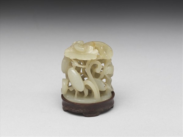 玉質,有褐色沁斑。雕鷺鷥群聚於蓮塘,多層次鏤雕,營造出水草叢生的視覺效果。附木座。