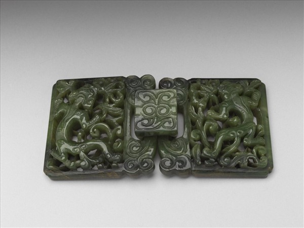 ⽟質,色碧綠。琢⽅形鏤空帶飾,中有方扣相連。器⾯雕螭紋及卷草紋。