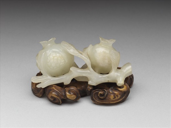 玉質,色青白。全器琢雙石榴,底雕粗枝橫貫,如座托般支撐果實。其中一顆琢有不規則形開光,內部雕石榴果粒。附木座。