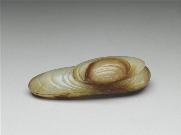 全器仿雙蛤貝類外形,略近橢圓,由整塊青玉雕刻而成,多處帶深淺褐色斑紋,依照玉石本身色澤雕出層層貝殼花紋,幾可亂真。