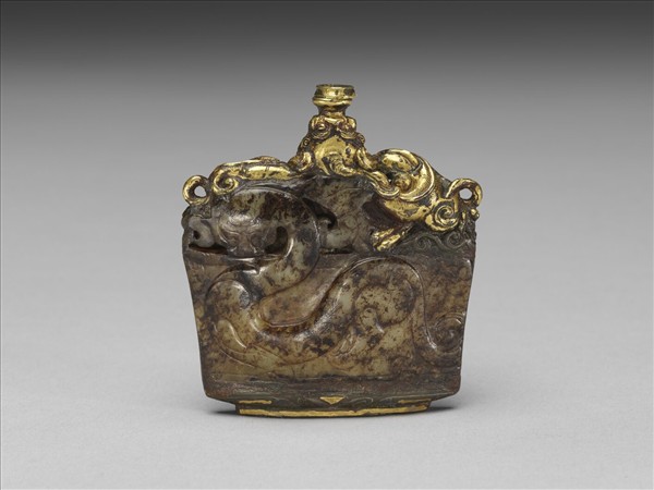 器腹部分原是一件西漢早中期玉劍摽,是劍鞘未端的嵌飾器。色青灰,一面浮雕螭紋,肢體矯健,且高出劍摽的梯形外廓;另面淺琢勾連雲紋。明代改製,將器內掏空,再於底部及口部鑲接鎏金及錯金銀的銅質部分,製為硯滴。