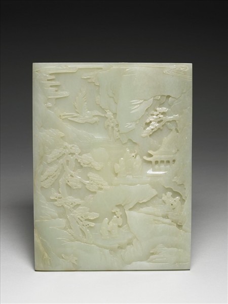 長方形青玉插屏,兩面均雕飾圖樣。一面環繞山石樹林,人物三兩成群前往峭壁間的高臺樓觀。臺上有高士遠眺,相對正有瑞鳳從天飛來。另面雕雙鶴於山林中,大片山石塊面層疊,松樹高起,樹旁之二鶴,一作勢欲上,一似正往下移動,兩相呼應,為靜態的景色增添生意。