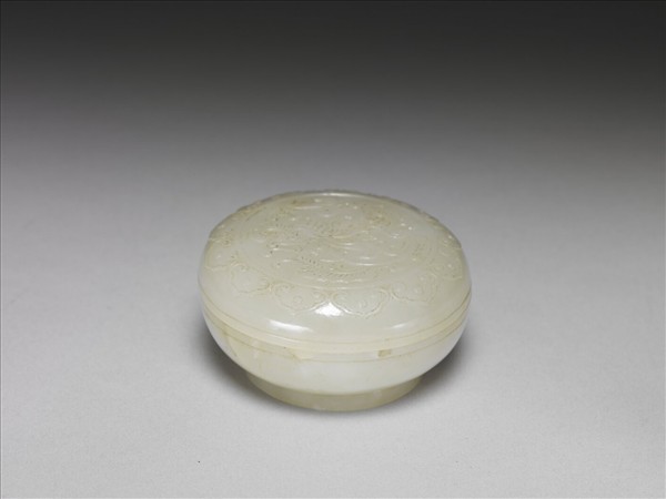 白玉圓盒,子母口,弧壁下斂,圈足。蓋面線刻雙圈花卉紋,外廓雕飾如意雲頭紋一圈。