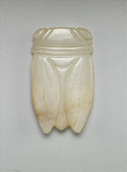 白玉蟬,帶赭斑,多位於玉蟬下半部。正面用長而弧順的線條區劃翅膀、頭部,蟬翼內再用兩道較淺的長陰線表現質理。背面刻畫蟬嘴,其上半部兩直線作「X」形交叉,應是暗示蟬足;下半部深刻橫凹痕表現腹部。