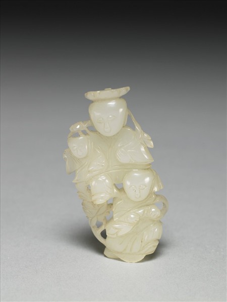 玉質,色白。雕花葉與母子三人。上半部雕母子二人,大小並排,作正面向,母親目光俯視,小兒亦隨之;下半部雕童子一人,縮肩、雙手曲置胸前,身形正欲向右方移動。三人手持蓮荷,植莖彎弧環繞全器。