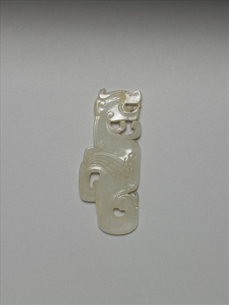 玉質,色白微泛褐色。外型近長方形玉片,一端雕龍首,一端琢鳳首。器中央以細線描摹羽翅,器緣輪廓以細線鉤勒,飾雙鉤卷雲紋。