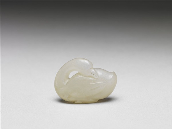 玉質,色白。全器琢一鵝回首斂翅,頸部彎弧,身驅近橢圓,僅作簡單條線表現羽翅,展現簡約溫婉的韻味。