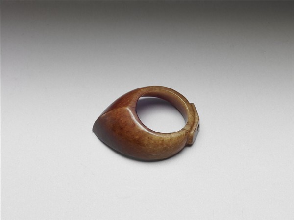玉質,泛赭色。橢圓形筒狀,一端平齊,一端口略斜,器外壁有方形凸起,上琢兩小圓孔。