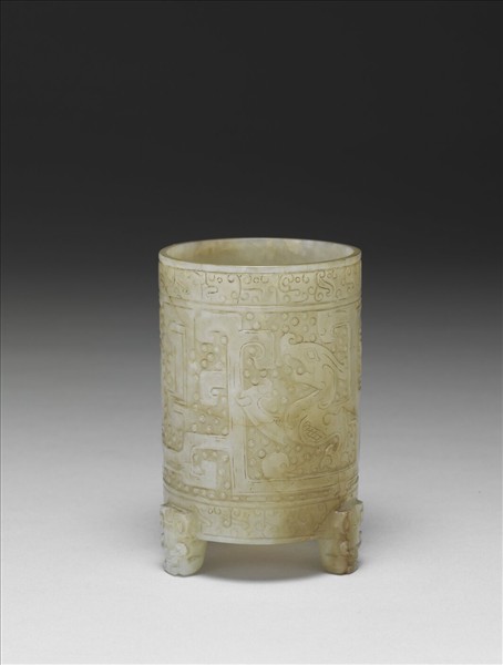 圓筒形,底下三獸首足,器身薄整。器外壁淺平浮雕側身龍鳳紋、乳紋,上下各一圈陰刻鬆散雲紋。乳紋保留明代管鑽留槽的特色,鳳紋的造型近似嘉靖款的雕彩漆上的鳳紋,此器屬晚明之作。