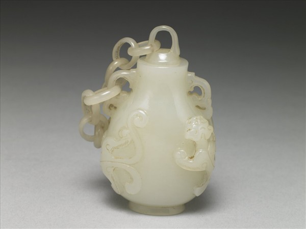 蓋與壺身以玉連環相接,器腹浮雕一蟠螭,圈足內陰刻「乾隆年製」款,缺匙。共40件鼻煙壺裝於一木匣,收藏於華滋堂燕喜堂。