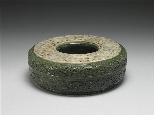 深色碧玉鏤雕而成之帶蓋環形盒,帶矮圈足。蓋面鑲嵌雙層鏤雕白玉片,底層為雲紋錦地,上層飾八吉祥圖案,雕工精巧細緻,圖樣雖繁複卻無雜亂之感。蓋之側邊與盒身外壁皆浮雕花葉紋,邊緣飾一周菊瓣紋。附白玉橄欖式十八羅漢手串一串。