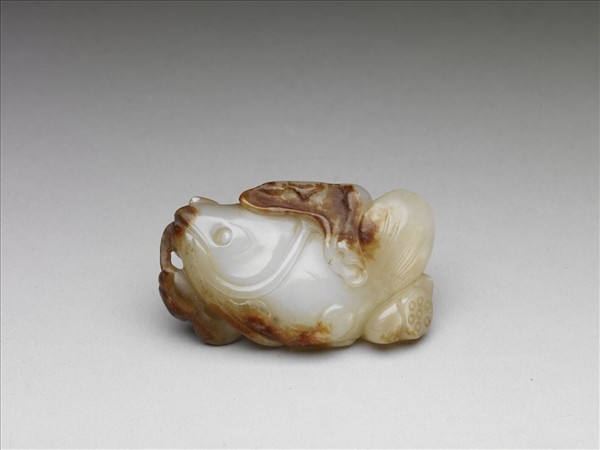 玉質,邊緣染褐沁。全器順著玉料本身形狀雕琢成一身驅肥短之魚形,尾鰭向上翹起。魚口啣一朵含苞蓮花,捲曲蓮葉繞於背鰭上,蓮蓬自尾鰭下方伸出。因「蓮」音同「連」,取其「連年有餘」之吉祥意涵。此器魚身部分多為白玉,沁色處皆雕為蓮身,為巧色作雕之作品。置於〈文竹柿式盒〉(故玉6500N1)中。