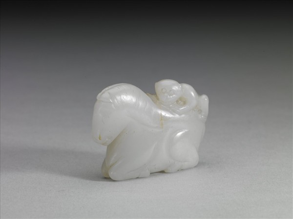 玉質溫潤潔白,外表加以仔細打磨拋光,色澤勻亮。全器雕琢成馬形,背上坐一隻猴子。馬呈蹲踞姿勢,頭向下微俯,鬃毛與周身雕飾簡潔的線條。馬背上的猴子雙眼圓睜,頭部棲於馬背上。馬身底部鑿有一圓孔,或許可作為穿繫繩子用。因猴音同「侯」,該玉飾有「馬上封侯」的吉祥意涵。