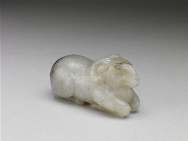 玉質,局部泛灰黑斑,器表佈滿褐點。此器以簡潔俐落的線條琢成羊形,呈蹲踞姿。