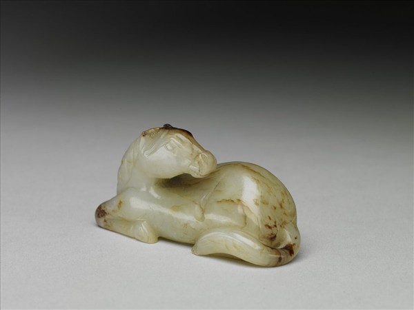 玉質,局部帶黑斑,有綹。全器以簡單俐落的刀法琢成馬形,馬身肥碩健壯,呈蹲踞回首姿。