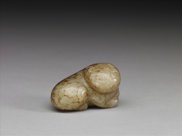 玉質,微泛黃,密佈褐斑並帶褐石皮。全器琢成一隻貓的形狀,貓朝右側呈蹲踞姿勢,周身線條模糊而不甚明顯。此貓頭部比例稍大,造型圓潤討喜,首部依稀可見雙眼、鼻部與微隆之雙耳。