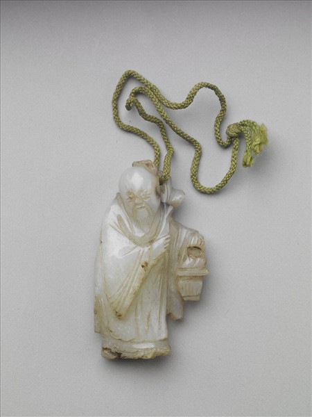玉質沁褐,雕一老人右手持樹枝,左手提籃,樹枝與身體間有一孔洞,穿有一綠色組繩。老者瞇眼向右望,神情平和安詳。