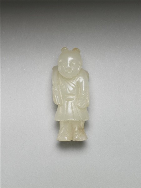 玉質,色微黃,立雕童子,梳雙髻,穿著交襟長上衣及長褲,右手持如意。張嘴大笑,神情生動活潑,衣紋線條較粗,輪廓明顯。