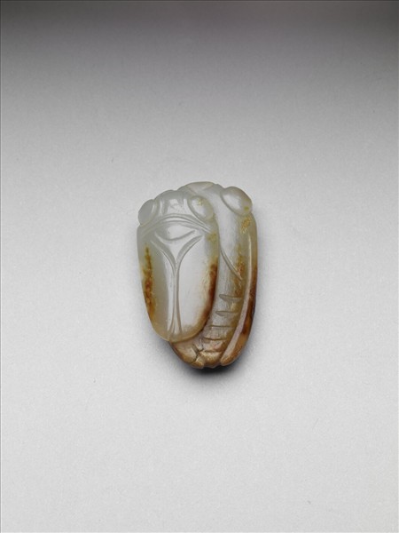 玉質,染雜色沁。全器琢成一大一小兩相堆疊之玉蟬,線條抽象化。